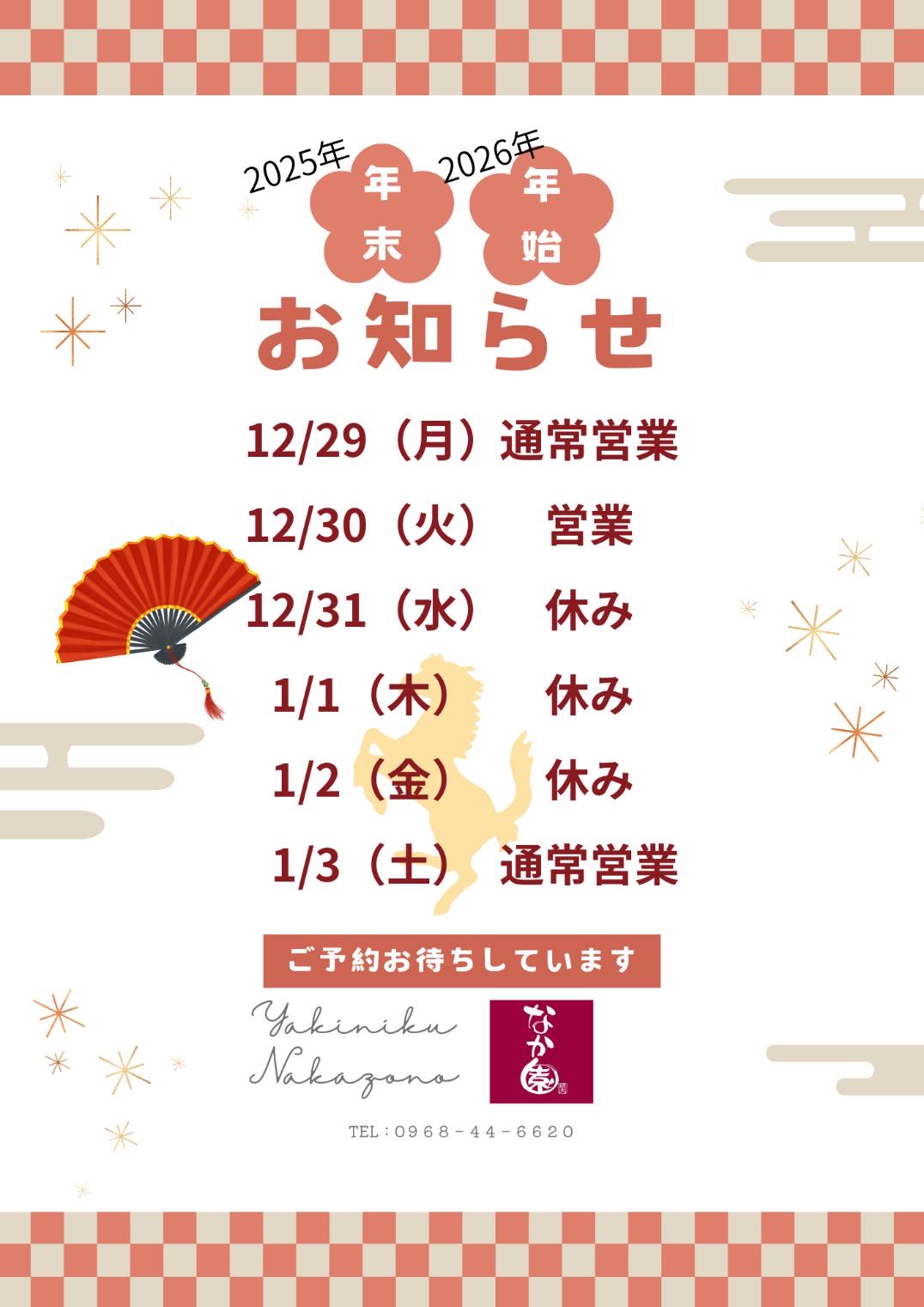 年末年始の営業について 2025.11.05 日頃より焼肉なかぞのをご利用いただき、ありがとうございます。 年末年始の営業についてお知らせいたします。 皆様のご来店心よりお待ちしております。 忘年会・新年会のご予約承っております! 前の記事